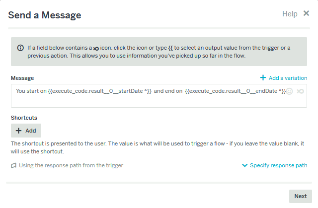 You start on {{run_a_query.format_date.date.result__rows__0__StartDate *}} and end on {{run_a_query.format_date.date.result__rows__0__EndDate *}} with {{run_a_query.result__rows__0__Description *}}